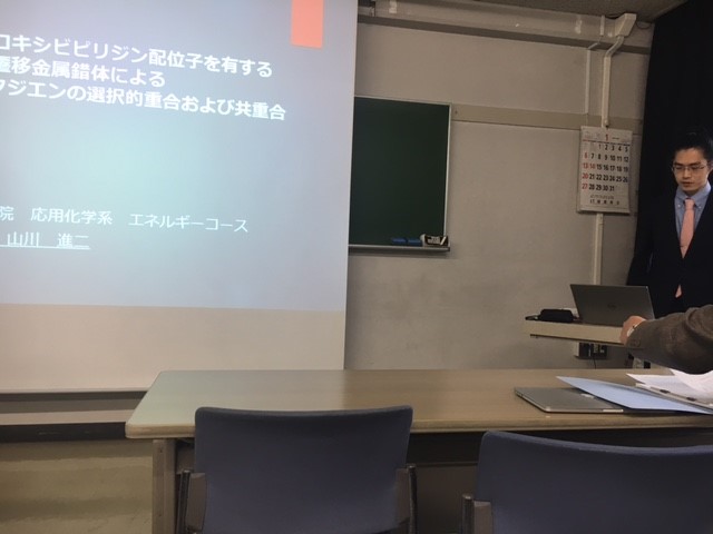 当研究室D3の山川 進二さんの博士論文公聴会の日程が以下のように決定いたしました. 発表題目「ジヒドロキシピリジン配位子を有する後周期遷移金属錯体による1,3-ブタジエンの選択的重合および共重合」 |